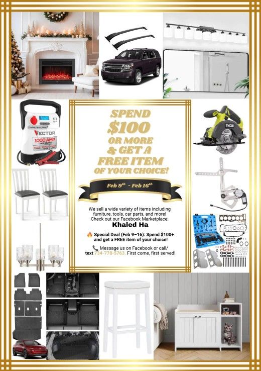We sell furniture, tools, car parts, and more. Special Deal (Feb 9-Feb 16): Spend $100 or more and get a FREE item of your choice. Check out our Facebook Marketplace: Khaled Ha Message here on OfferUp for details. First come, first served!