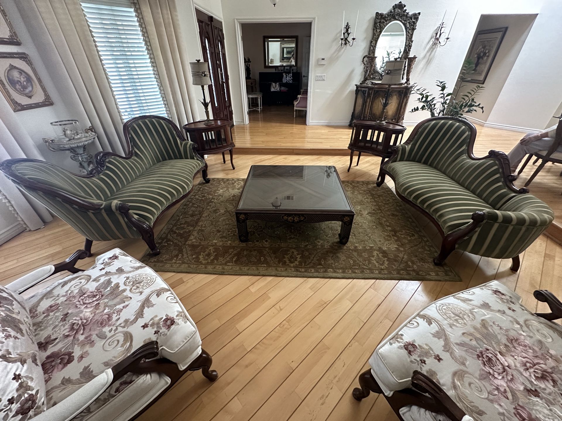 This set includes: - 2 sofas e, medium brown wood and gold/green velvet fabric - 2 side table and cabinet, medium brown wood - green rug - 2 table lighting More pictures can be provided upon request