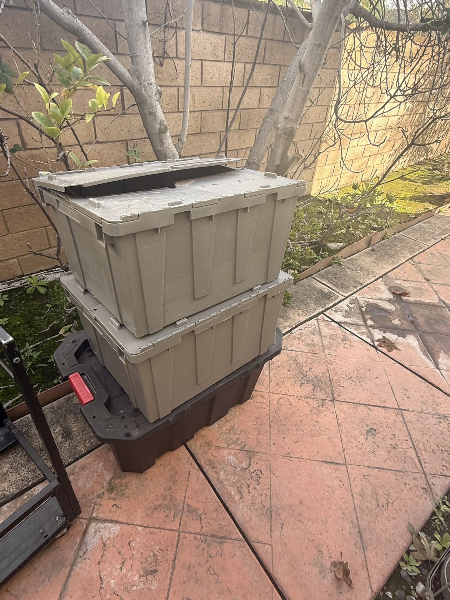 5 sturdy plastic storage bins w dolly for easy transporting. Price is per each bin