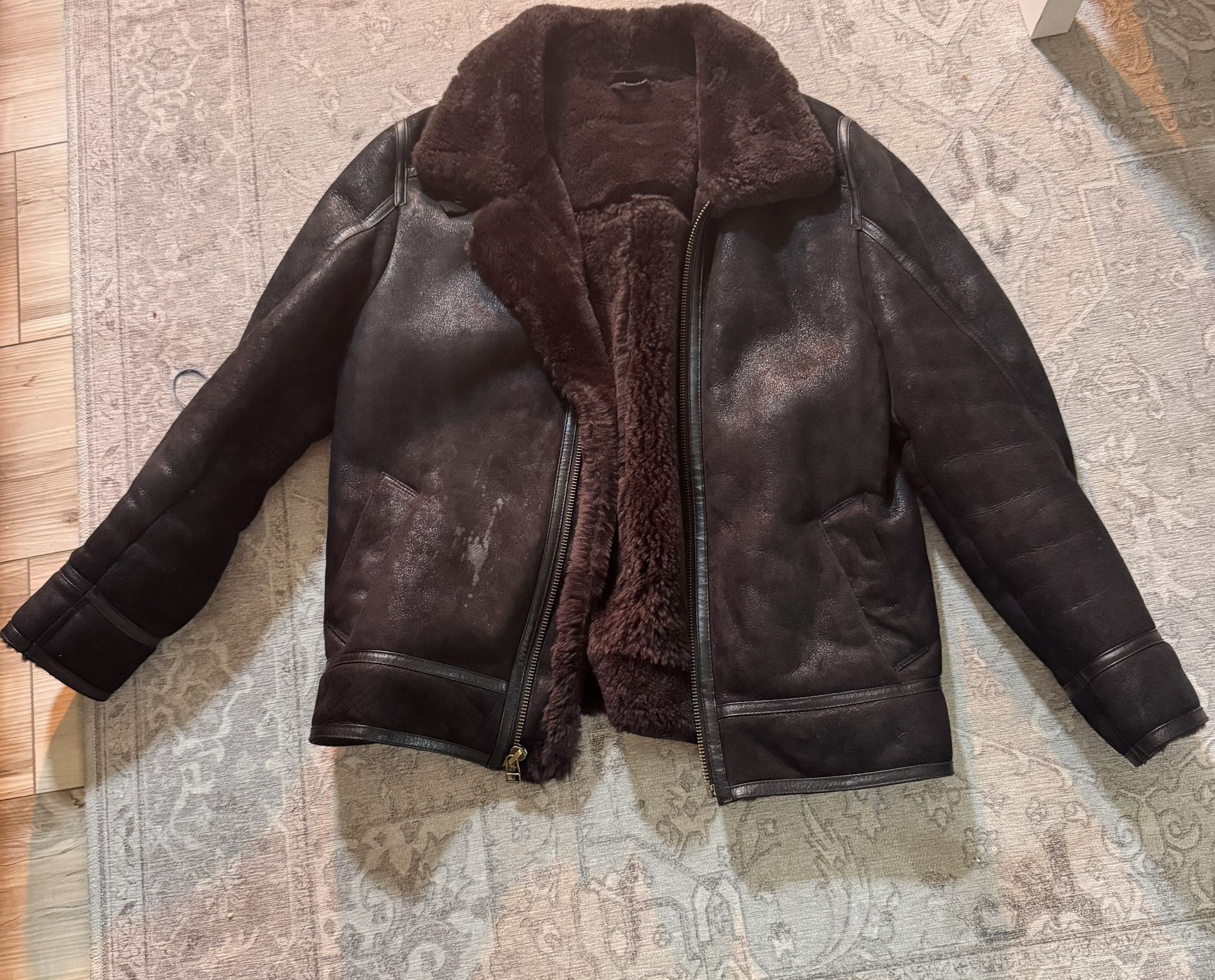 Great condition , barely worn. Current website price is $795 https://offerup.com/redirect/?o=aHR0cHM6Ly93d3cub3ZlcmxhbmQuY29tL3Byb2R1Y3RzL2NsYXNzaWMtc2hlZXBza2luLWItMy1ib21iZXItamFja2V0LTE2MTQzP2NsPWJsYmw=