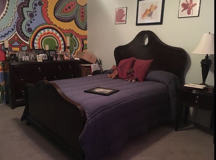 Brand is Stanley. Normal wear and tear. Full size bed (headboard and footboard) with mattress. Mattress is in excellent shape, hardly used. Night stand and dresser. Armoire sold separately for 100.00