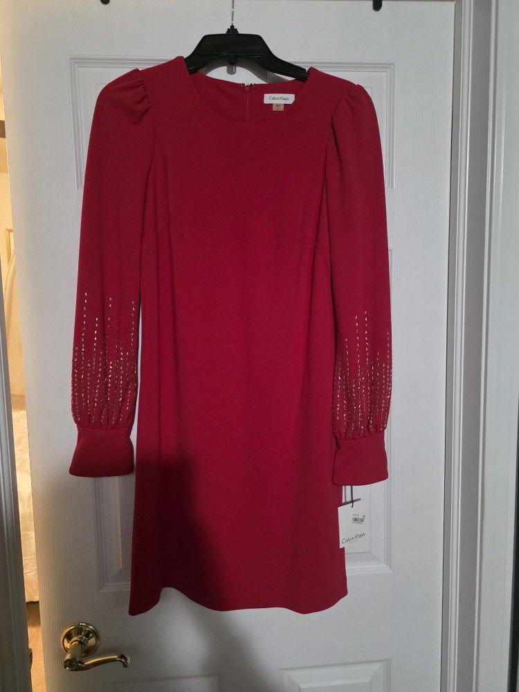 This is a Calvin Klein size 6 long sleeve dress. It goes up up to your knees and it is red. It is Brand new with tags.