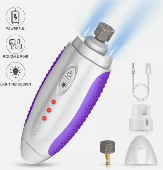 The diamond drill grinder is equipped with a safety protective cap, which can easily and quickly trim pet nails anywhere. 2. Unique lighting design, convenient to check dog nails at any time, to avoid bleeding caused by blood line rubbing. 3. Equipped with three ports and three levels of adjustable power, suitable for small, medium and large pets of different sizes of nails, according to pets Select the appropriate port and power for the size of the object and the hardness of the nail. 4. Ultra-low noise and vibration: using high-quality motor, running noise is small, will not scare pets 5. Rechargeable and convenient: the bottom usb charging hole and the hidden design of the replaceable nail head make it more convenient to use Specification: 1. Product size: 14.5 * 5 * 2cm 2. Color: gray,purple 3. Material: ABS 4. Weight: about 170g 5. Scope of application: 60% power (5400r / s) is suitable for hamsters and guinea pigs; 80% power (7200r / s) is suitable for cats, rabbits, Small dogs; 100% power (9000r / s) medium and large dogs. 6. Battery capacity: 500 mA Charging: 5V / 1A 7. Charging / use time: 2 hours of full charge, can be used continuously for 3 hours Package list: Pet Nail Grinder * 1 USB cable * 1 Polishing head * 2 Manual * 1