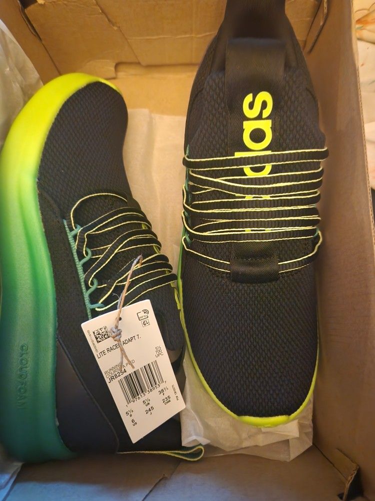 Brand New Never Used with box Adidas Brand Lite Racer Adapt 7.0 Size 6 which is also converted woman's side 7.5-8 or mens size 6. They are in perfect condition never been worn still with box and tags. Black with lime fading into dark green. These would be great for working out or even just an every day shoe. Or if you have a kid, these would also be great for back to school. Check my page for more items you may be interested in. Thanks for looking Pickup in Great Neck area of Virginia Beach.