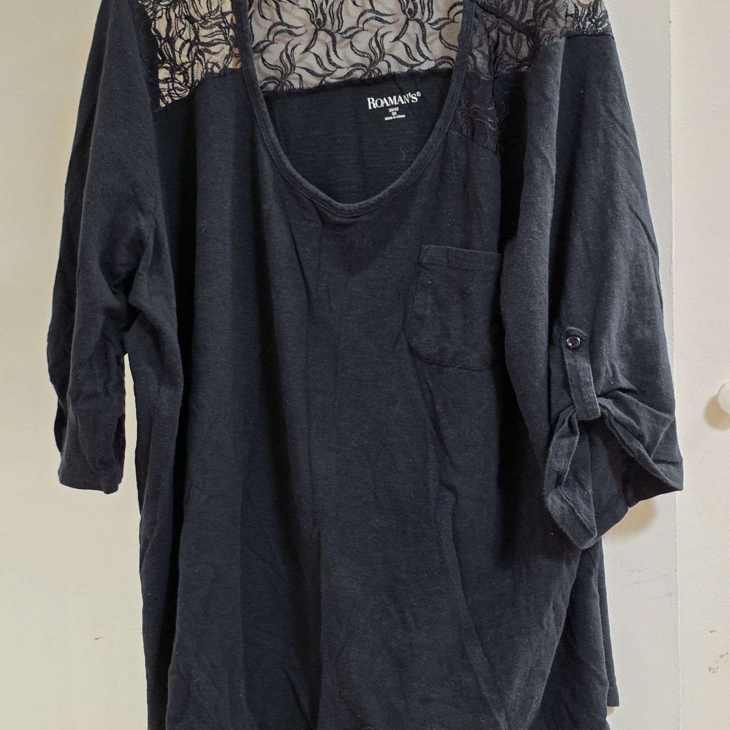 Black 3/4 length sleeve top with lace on the shoulders, size 3xl