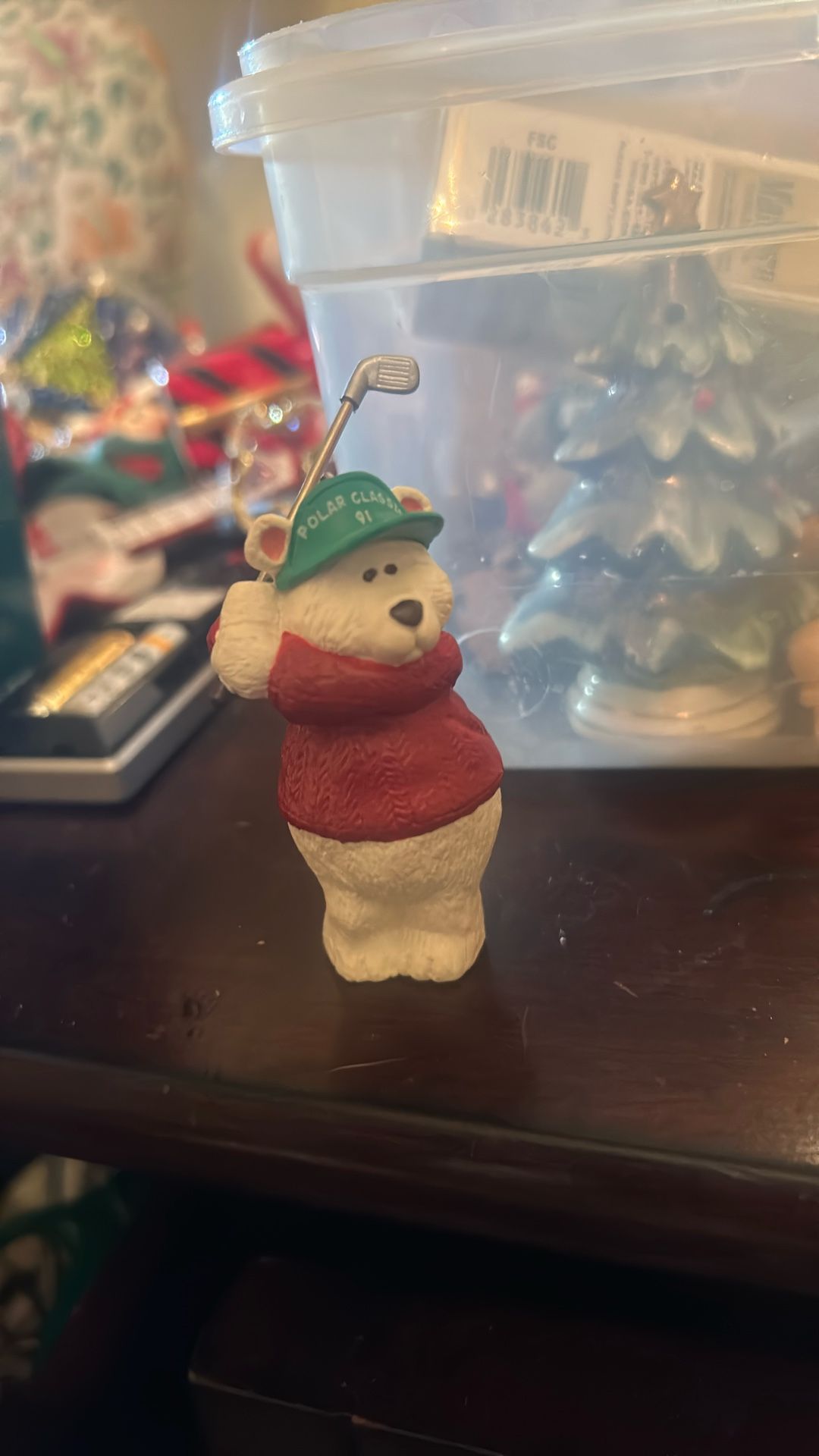 These are Christmas tree ornaments. This one is a teddy bear with a golf club golfing for Christmas very tropical great for Florida to put on a Florida style tree or to give to a golfer vintage hallmark item.