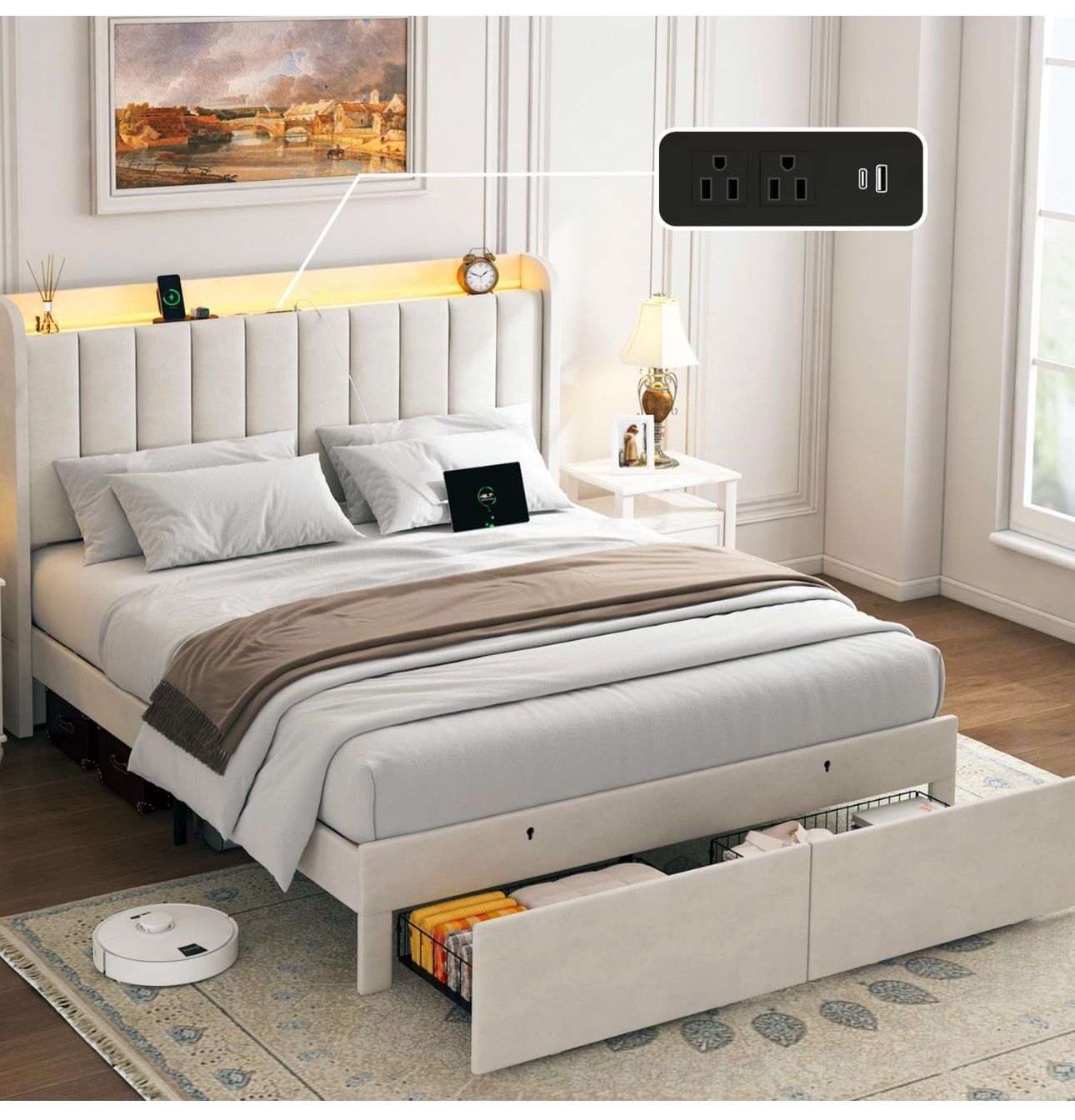 Bed Frame Queen Size with Drawers and LED Lights, Upholstered Platform Bed Frame with Charging Station