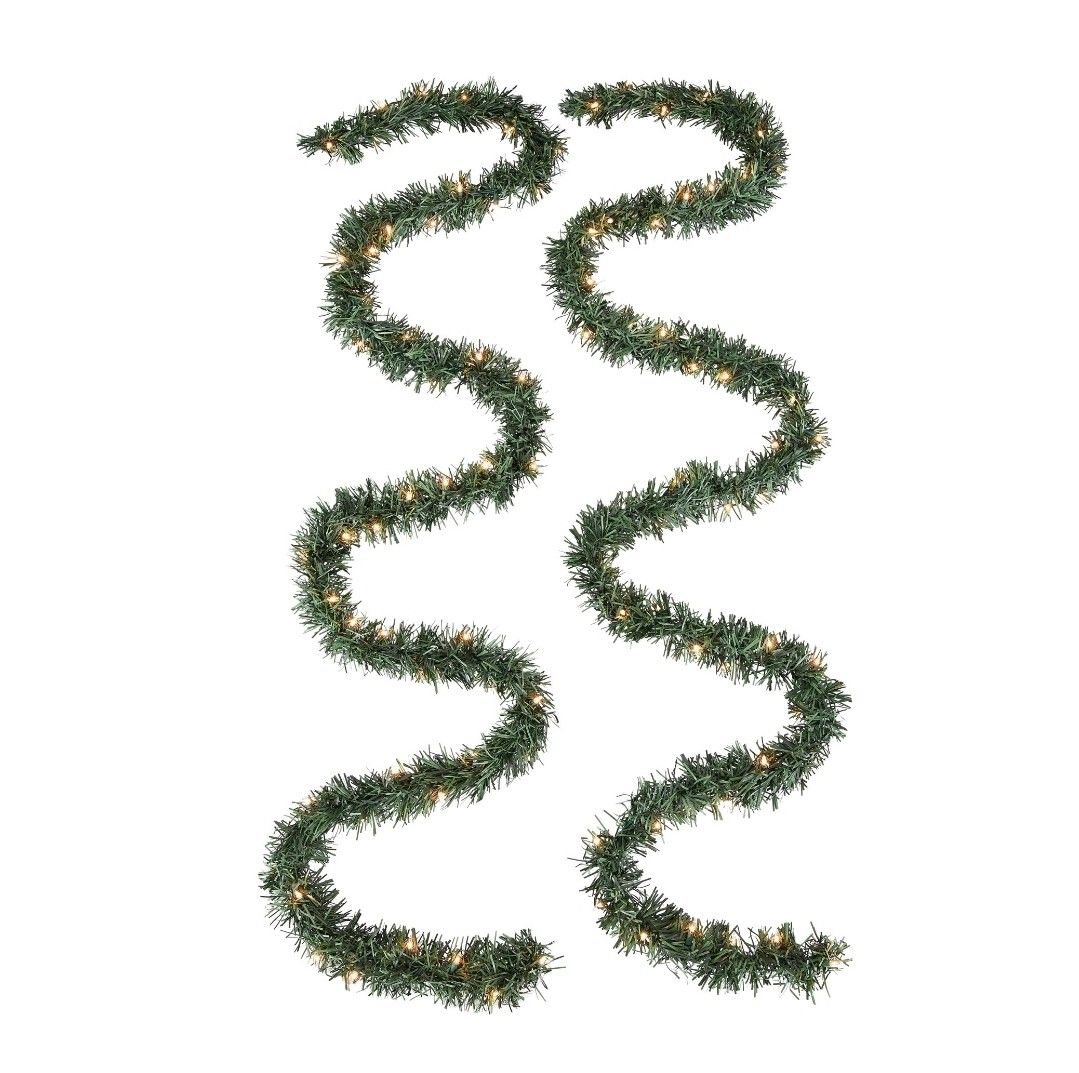 - Set of 2 artificial Christmas garlands measure 9' long each - Each garland has 50 pre-strung clear lights (100 total) that glow beautifully and give your holiday décor a lively feel - Garlands are long enough to decorate mantles, windows, doorways, handrails, staircases, railings, balconies, and more - Connect up to 10 garlands end-to-end Garlands look festive on their own or can be incorporated into a larger holiday display -Long-lasting Christmas decoration will help you celebrate the holiday season for years to come - All bulbs stay lit even if one burns out 120V 60Hz AC For indoor/outdoor use Flame retardant Color: Green Weighs 1.88 lbs. each Product dimensions: 6" W x 9' L each