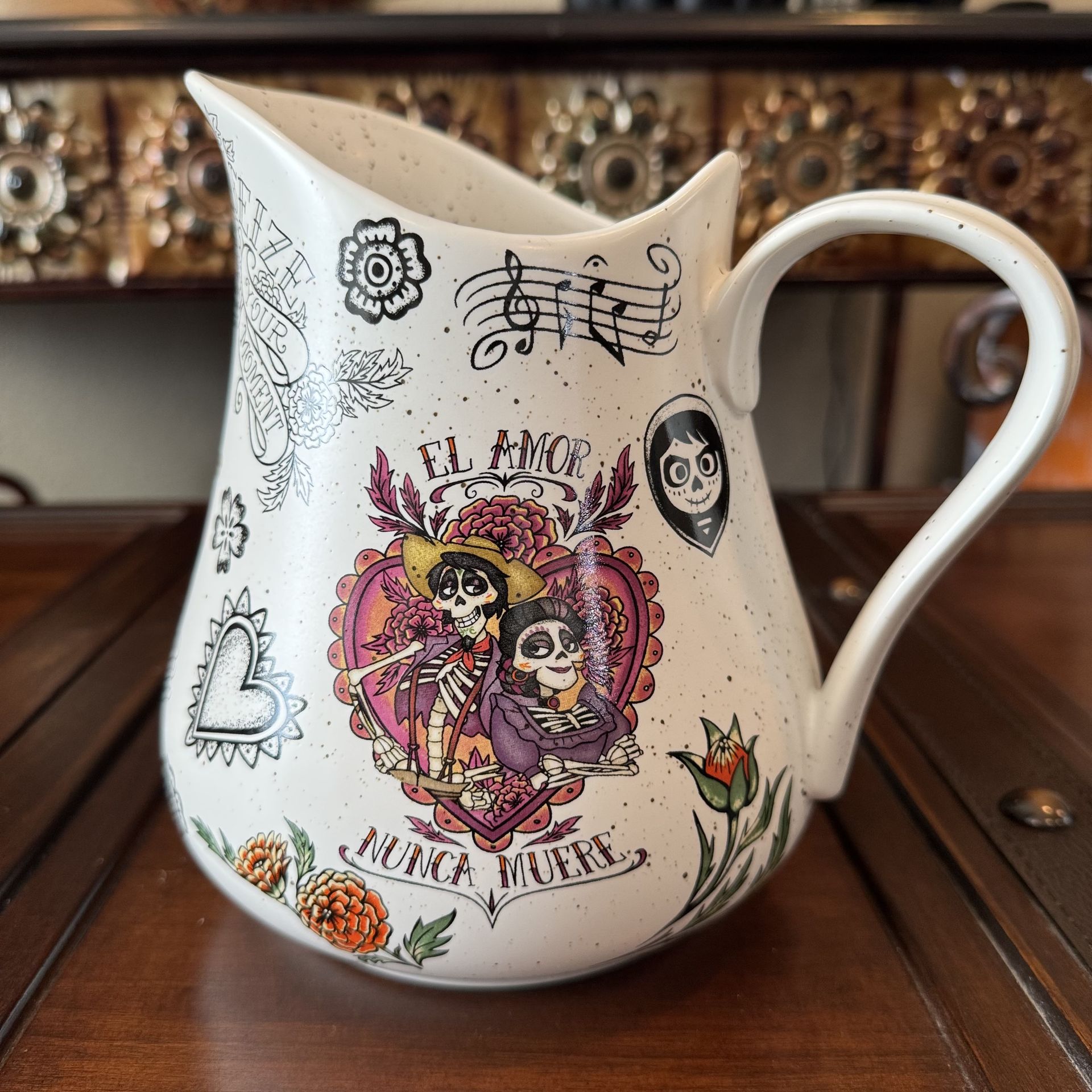 Brand new and never used, had this stored away safely. Ceramic pitcher featuring the characters from the Disney movie Coco. Reads "El amor nunca muere." Approximately 7.5'' x 6'' x 7 1/2''. Weighs 2lbs 6.5oz. Our cross streets are Clinton and Brawley.