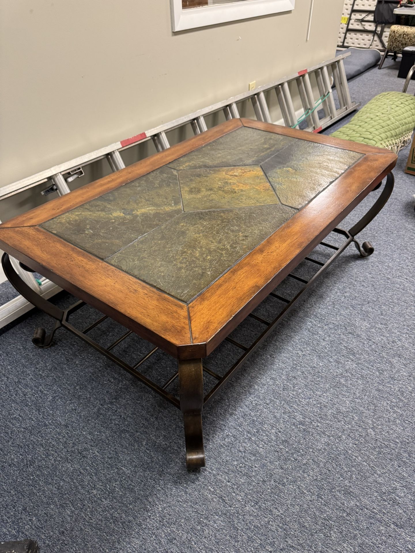 Good condition, sturdy coffee table Tile / wood for table top Metal frame with storage shelf underneath Measurements attached
