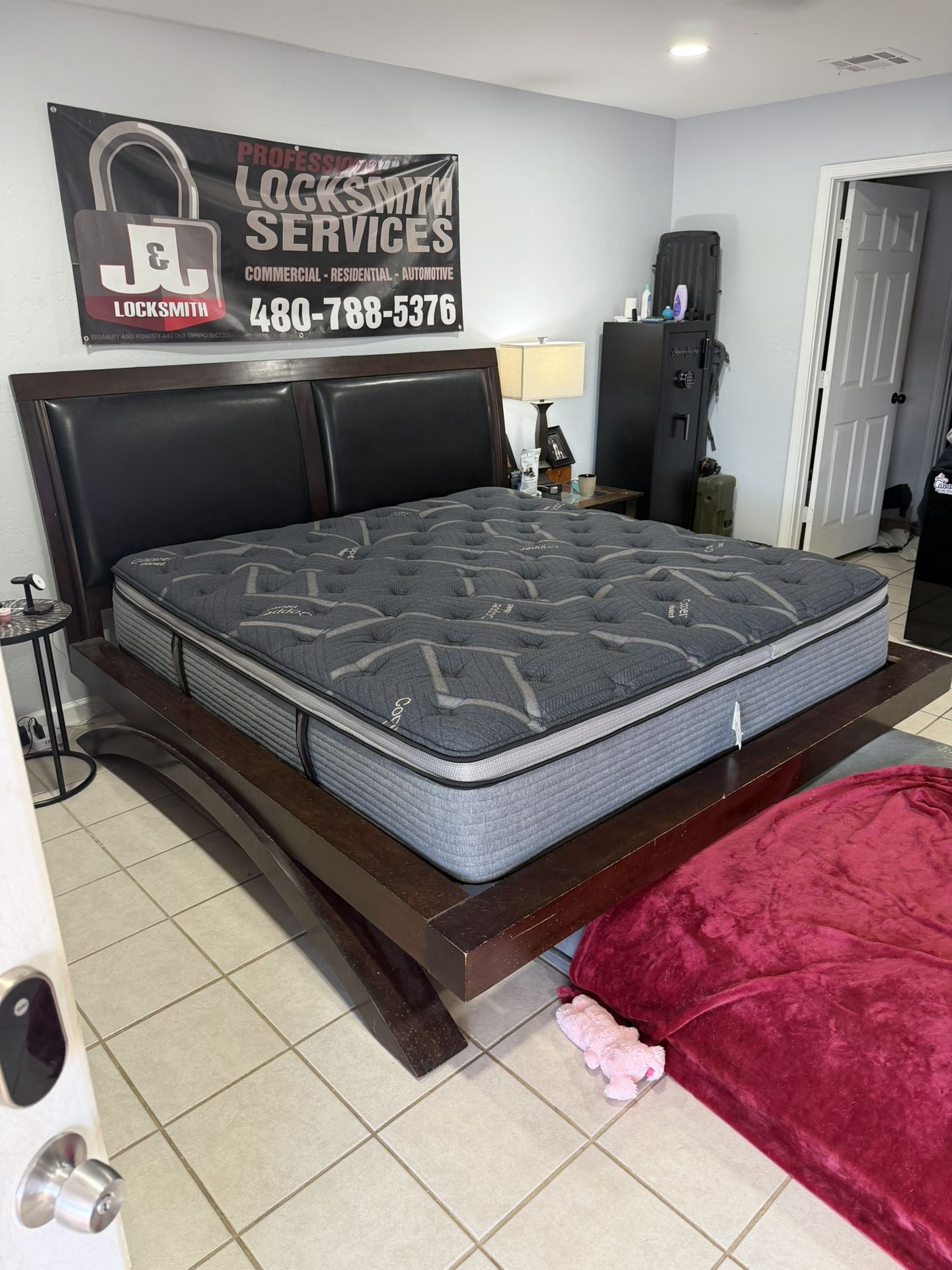 Sleigh bed frame King size Black pleather accent in the headboard Normal ware was going to sand and re- stain but purchased a whole new style instead Already disassembled, ready for pickup. Will deliver for small fee. AZ and McQueen in Chandler