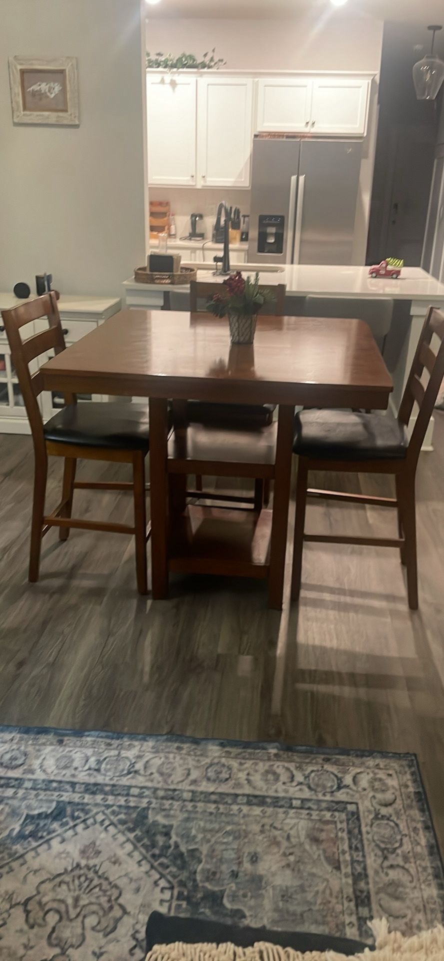 a high-top dining set with shelves made of solid wood, consisting of a table and three counter-height chairs. Here are the dimensions: - Table: 40 inches long, 40 inches wide, and 37 inches high. - 3 Chairs: 24 inches from the floor to the seat, and 41 inches in total height.