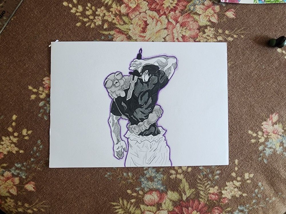 Pencil sketch of Toji Fushiguro from Jujutsu Kaisen. Hand drawn horizontally on ***12 X 8.5*** inch paper Has purple color pencil aura glow It ain't much but its honest work Keep in mind its hand drawn, it won't be as accurate as a poster or print Need to pick up