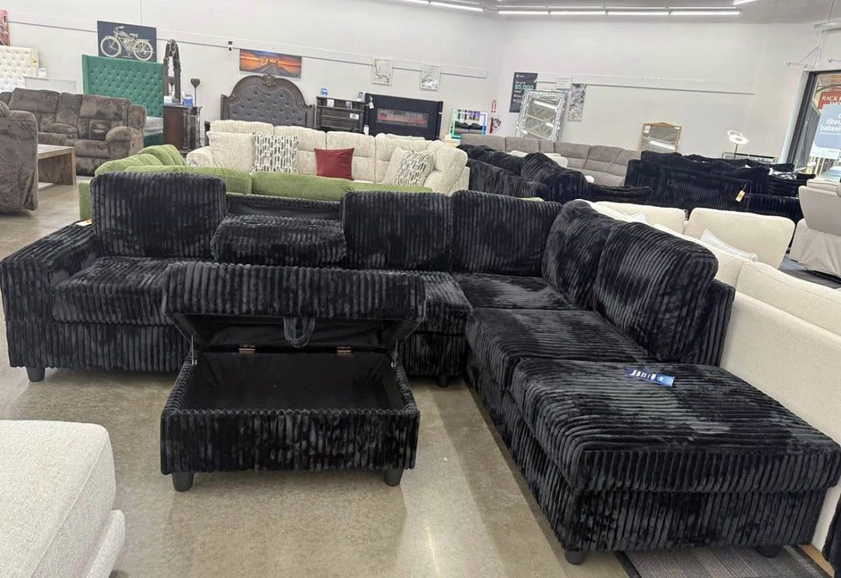•Everything always brand new in boxes!! •Si Hablamos Español •Cash Price $699 Or •3 easy monthly payments with 90 days no interest •Easy online apply finance Material: Cord Fabric Color: Black Description: Reversible Sectional and Storage Ottoman Set (Sold as Set Only) Sleek, simple, and modern. This sectional covered in a black cord fabric and features a drop down cup holders table and a storage ottoman. Dimension: RAF SOFA: 78L x 34D x 34H LAF CHAISE: 80L x 34D x 34H Storage Ottoman: 34 x 24 x 18H More styles More selections All your home furniture needs Ready for self pick up or delivery 🚚