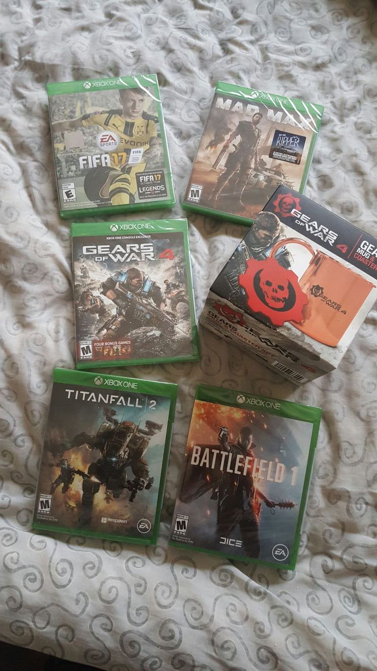 Gears of war 4 exclusive(including 4 bonusgames on disc), battlefield 1, titanfall 2, fifa 17...all brand new in plastic $40/obo each....mad max brand new in plastic $30