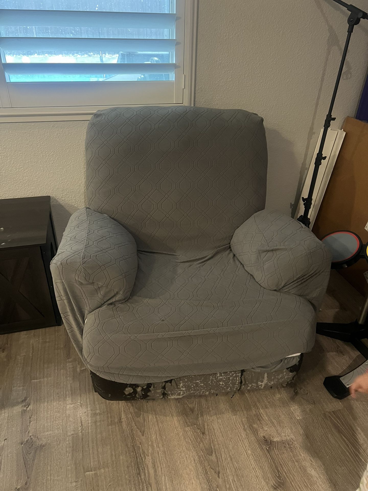 Black leather recliner that is peeling really bad. We’ve kept it as long as we can using a gray recliner cover that sometimes rides up when sat on so it probably will do better with a new cover. Haven’t had time to take it to the dump. Need gone asap.