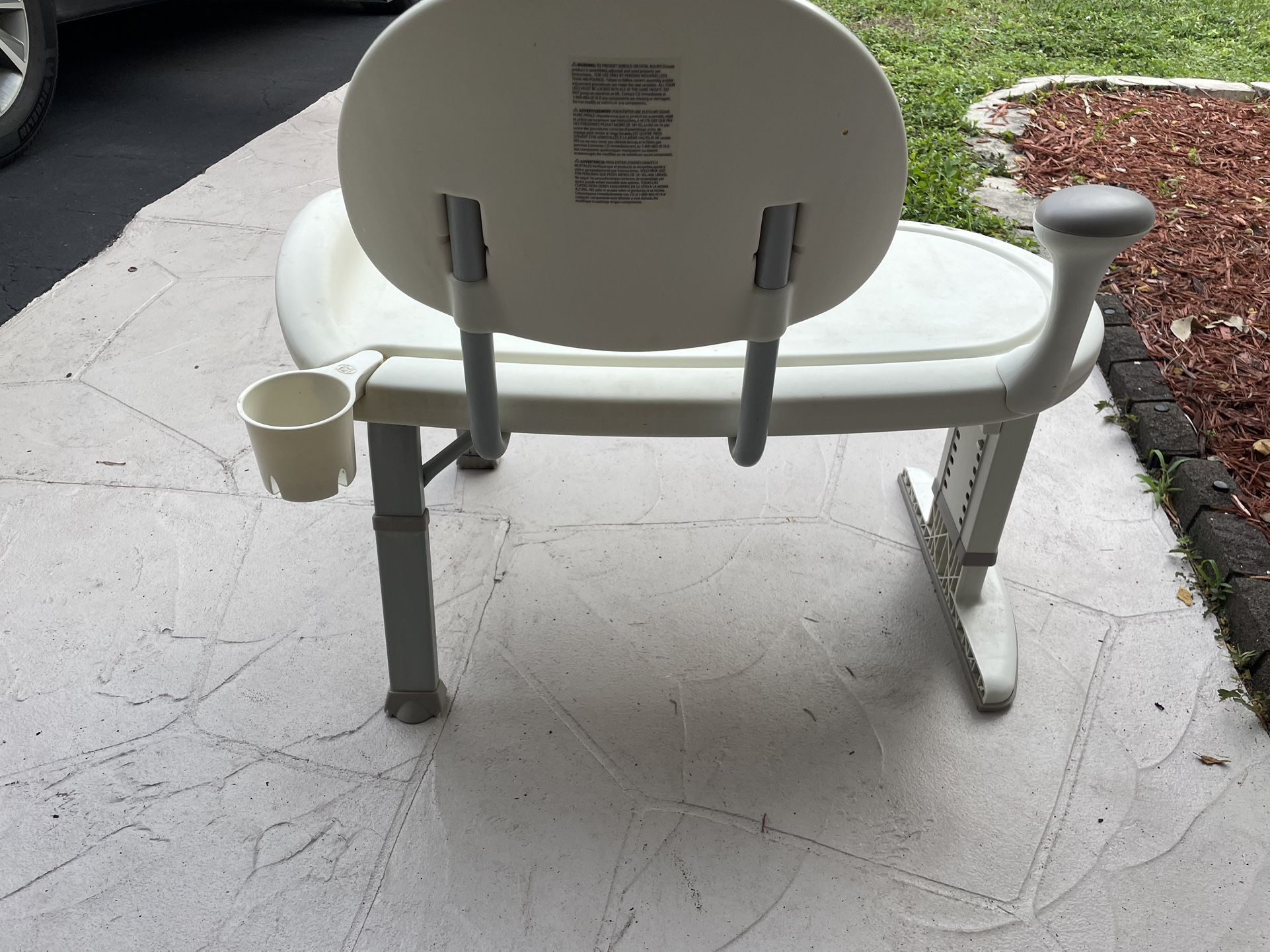White Durable molded plastic seat and support backrest with non-slip rubber adjustable aluminum legs. Wide, contoured seat with drainage. One padded armrest/handle for stability Built-in cup holder. One side designed to sit inside the tub while the other stays outside.