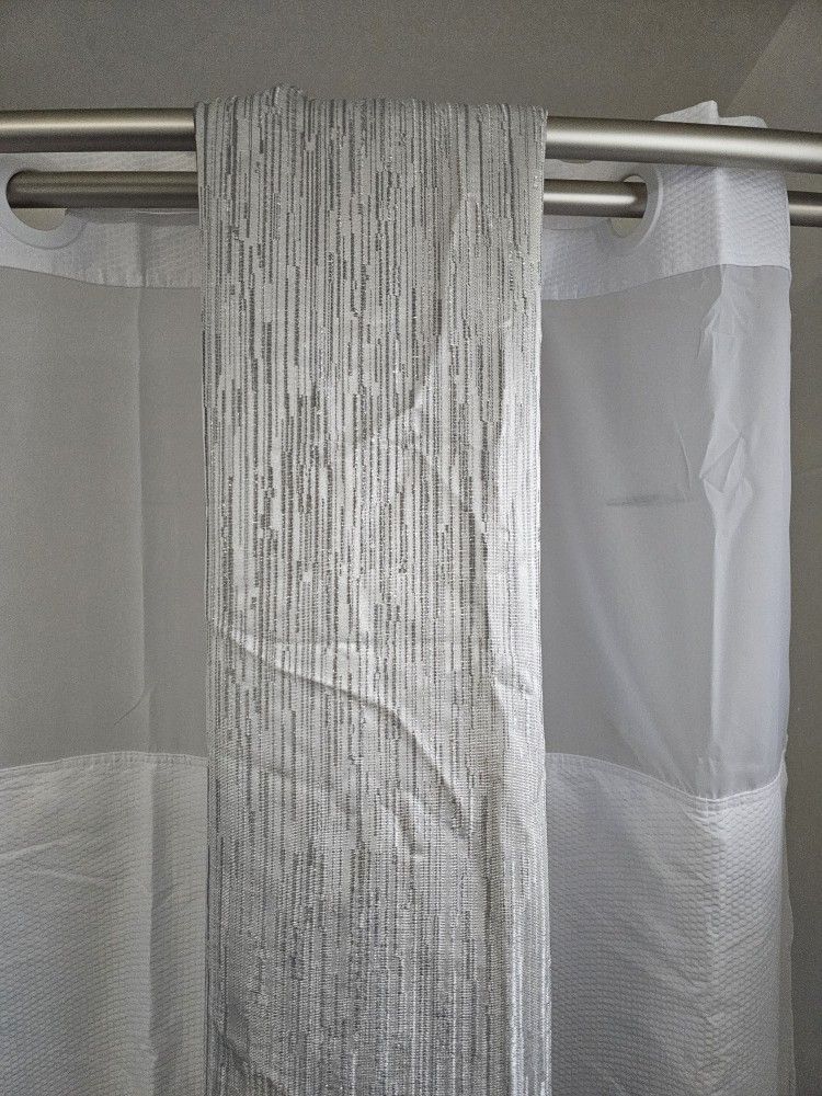 Clean shower curtain. No stains, rips or tears. Good quality fabric.