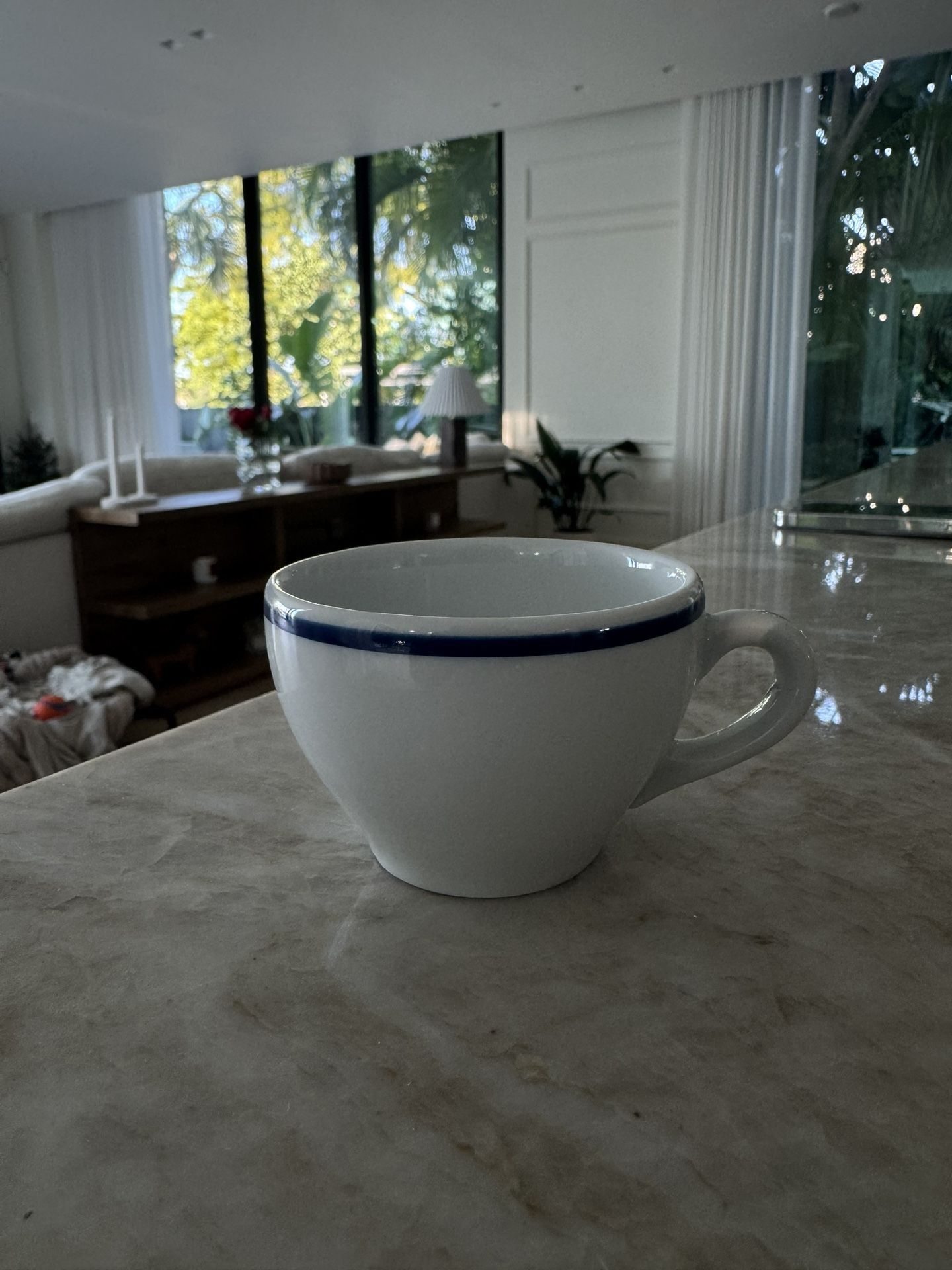 Pristine white porcelain dishes with classic blue borders. Apilco's signature white dinnerware restaurant-quality pieces can be dressed up or down with formal or casual linens, flatware and glassware. Made of high-fired porcelain. It is in great condition. They are microwavable; oven, freezer and dishwasher safe. Made in France. Cup: 8-oz. cap. Saucer: 6 1/2" diam. Made in France