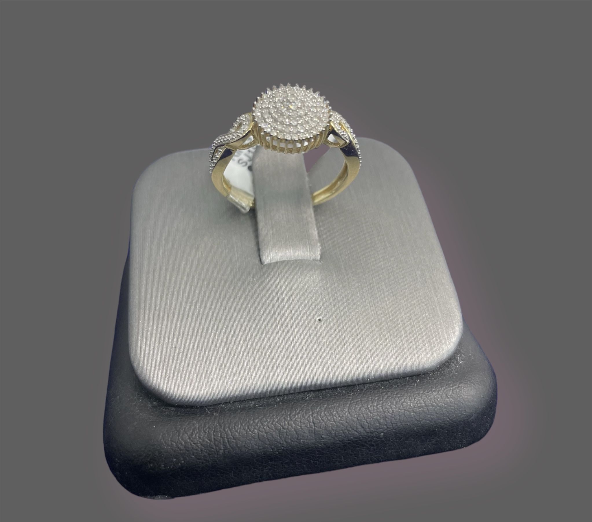 This exquisite 10 karat gold and diamond ring exudes timeless elegance and sophistication. Crafted with meticulous attention to detail, the band boasts a lustrous 10 karat gold setting, providing the perfect backdrop for the dazzling diamonds that adorn it. Each diamond is expertly cut and meticulously placed to maximize brilliance and sparkle, creating a mesmerizing display of light with every movement. Whether worn as a symbol of love, a statement of style, or simply to add a touch of luxury to any ensemble, this ring is sure to captivate attention and inspire admiration.”