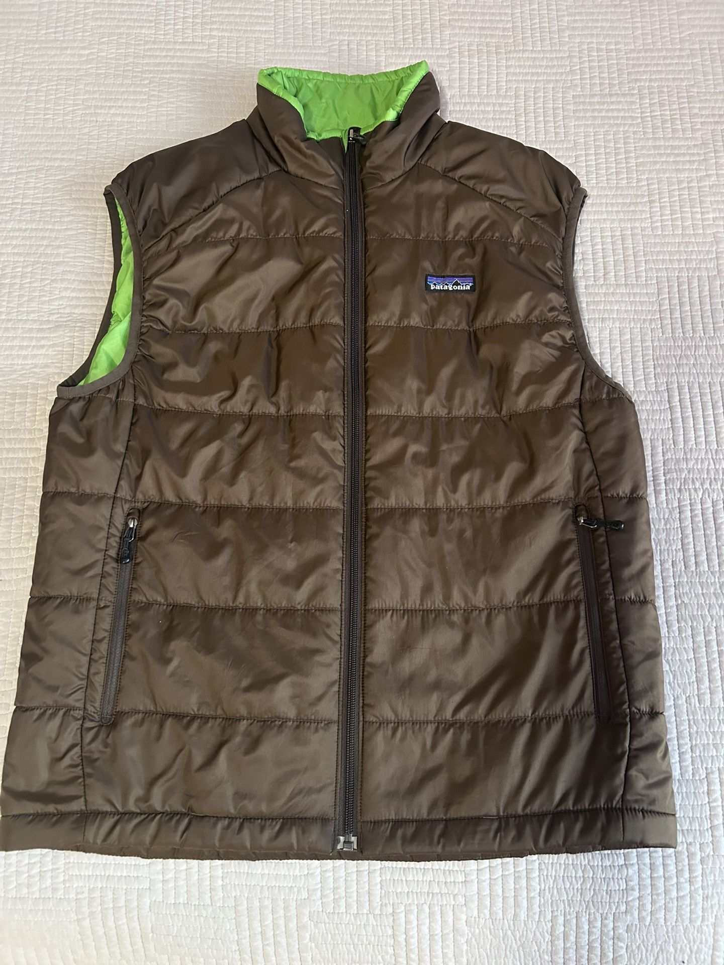 Authentic Patagonia men’s insulated puffer vest in brown with green interior lining. Lightweight but warm—great for layering, hiking, camping, travel, or everyday wear. • Men’s size Medium • Full-zip front • Insulated / puffer style • Zippered hand pockets • Patagonia logo patch on chest • Green interior lining • Well-made, durable outdoor vest Pre-owned in good condition with light normal wear.