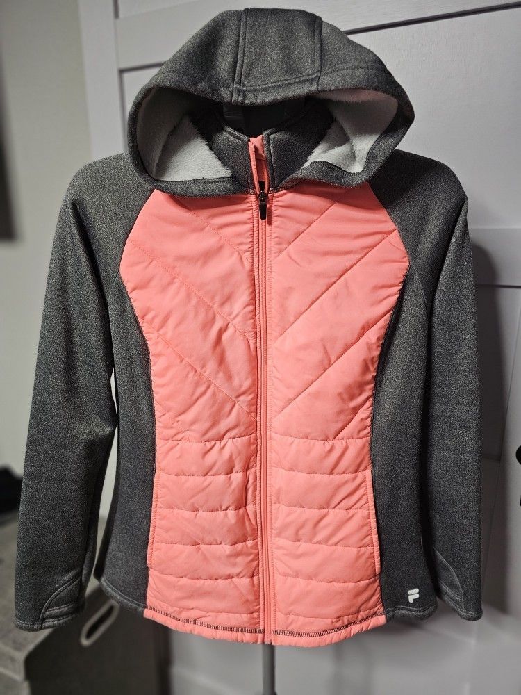 This item is a Fila Sport Women's Quilted Hooded Jacket in a gray and orange color combination. It features a full-zip closure, a hood, and a quilted orange panel on the front for warm comfort. Clean. Only used once. Size: Large Brand: Fila Sport Style: Full-zip hooded jacket with a quilted front panel Material: 100% polyester for both the outer shell and lining, making it durable and easy to care for. Features: Includes thumb holes and is designed for athletic or outdoor activities. ***Committed & interested buyers only!