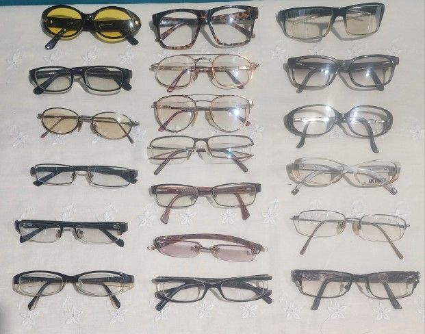 19 pieces Reading Glasses. Assortment of Brands, Designs, Sizes, Colors. One piece brand new by Karl Lagerfeld. Smaller glass frames at $3.00, Larger frames at $5.00.