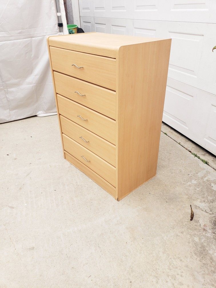 Dresser with 5 drawers, drawers are on rollers and opens and closes very smoothly. Slight minor wear on bottom corner as seen in photo ( cosmetic only). Works perfect and in great condition. Measures 30" x 18" x 42" tall.