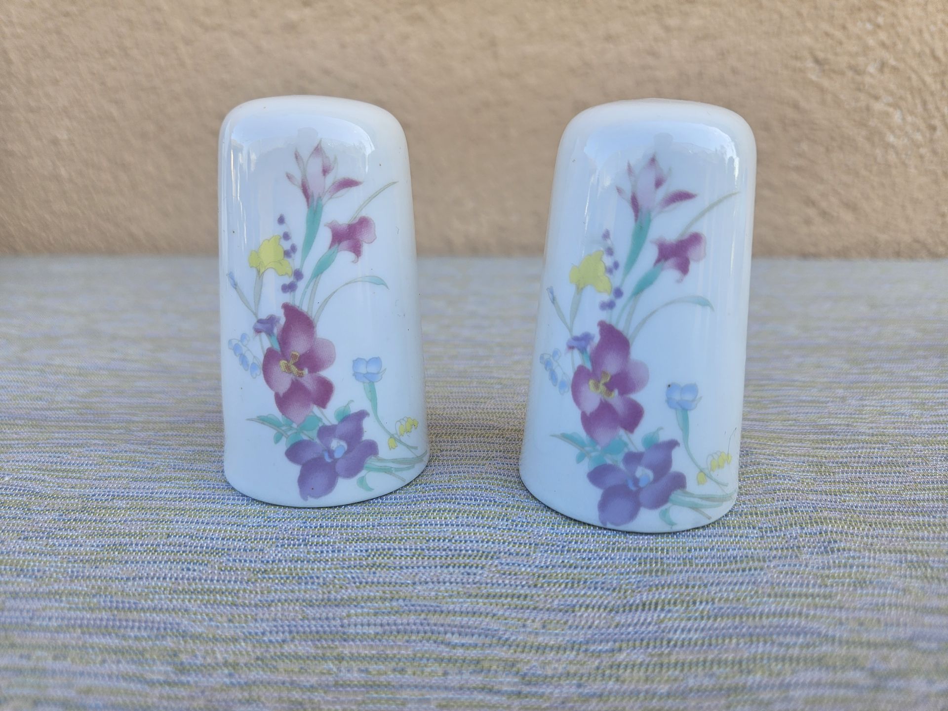 Add a touch of elegance to your dining table with this beautiful set of porcelain salt and pepper shakers. Featuring a delicate floral pattern with pink, purple, and yellow flowers on a white background, they are perfect for everyday use or special occasions.