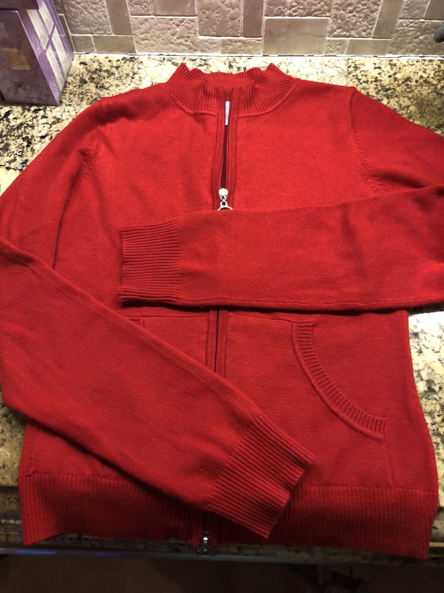 Body hugging cardigan with zipper. Machine washable and dryable.