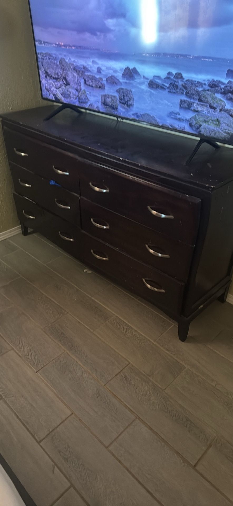 6 drawer dresser. About 2.5 feet tall. Brown, used. Still works. No drawers are broken or legs. Just been used.
