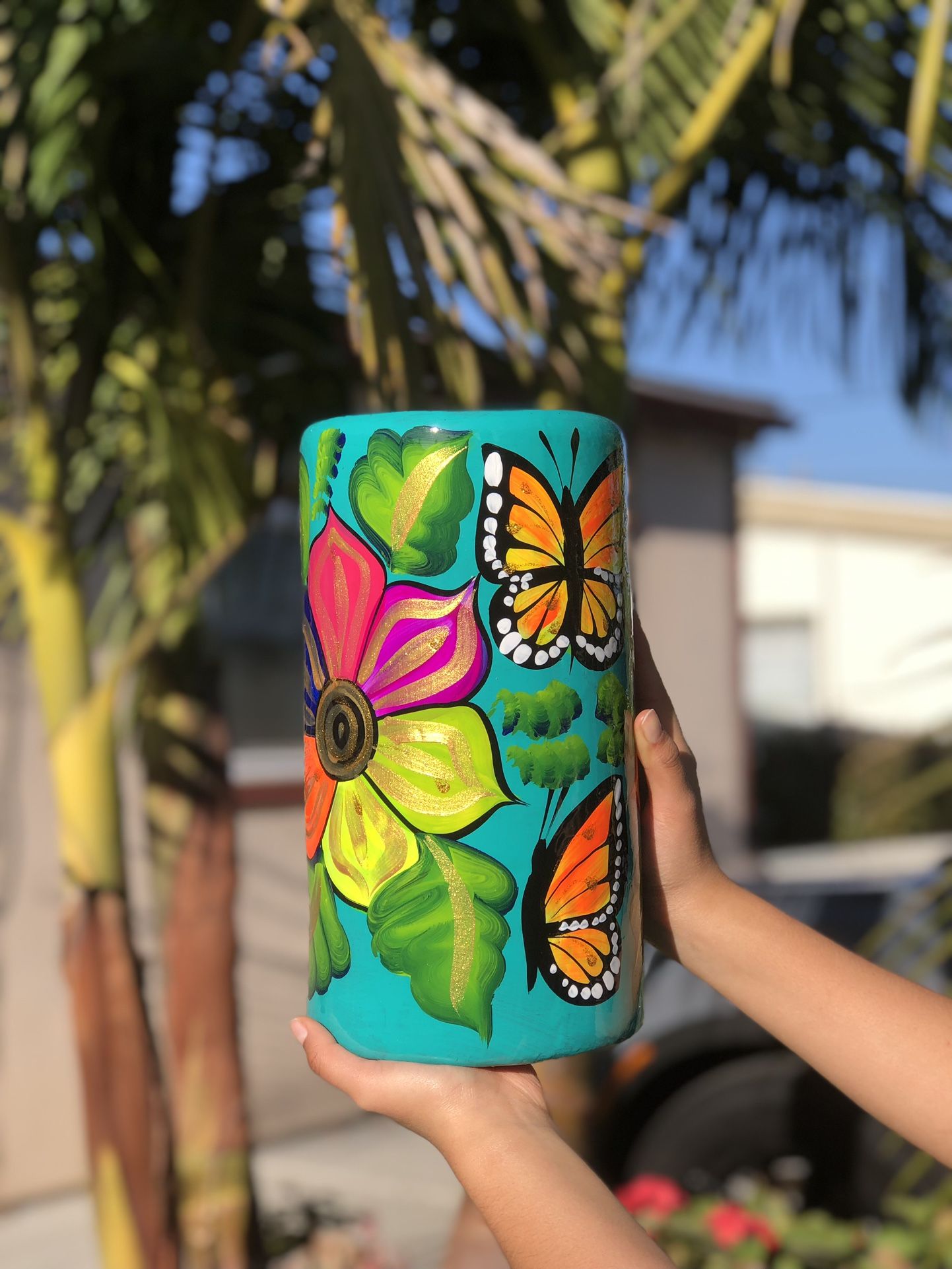This is another vase from Oaxaca that is also hand made and hand painted. Each drawing is precisely done and thought. The flower on the vase has different vibrant colors that makes it stand out and make it unique. The teal green making the flower and the butterfly stand out, this decoration will absolutely make your house look authentically charming. Measurement: Height-11in Width-5in