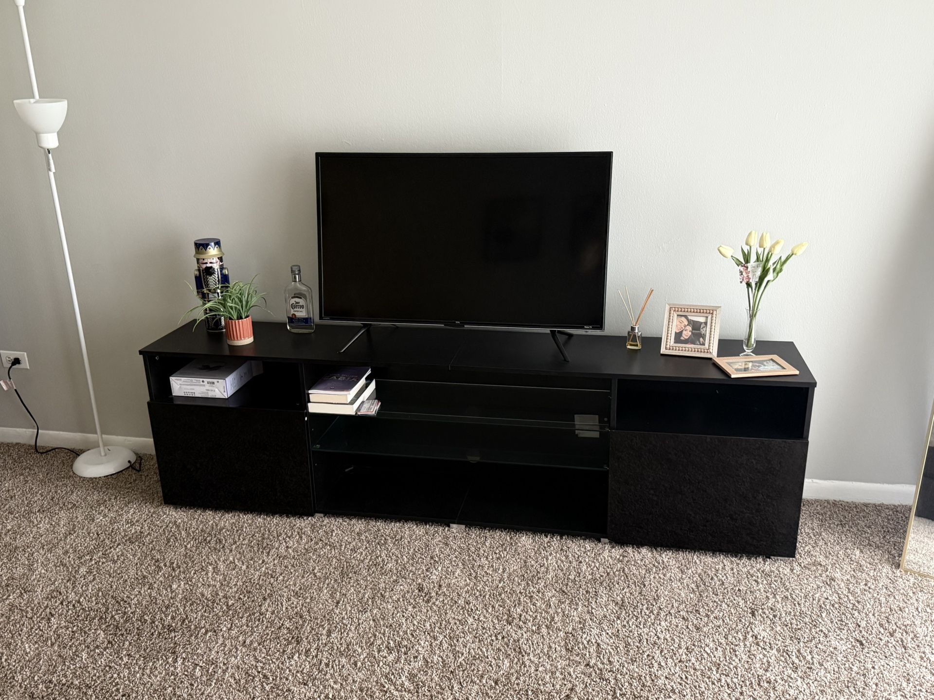 Living room sofa and TV stand are sold with the TV. Everything is used like new. It was just my partner and I.