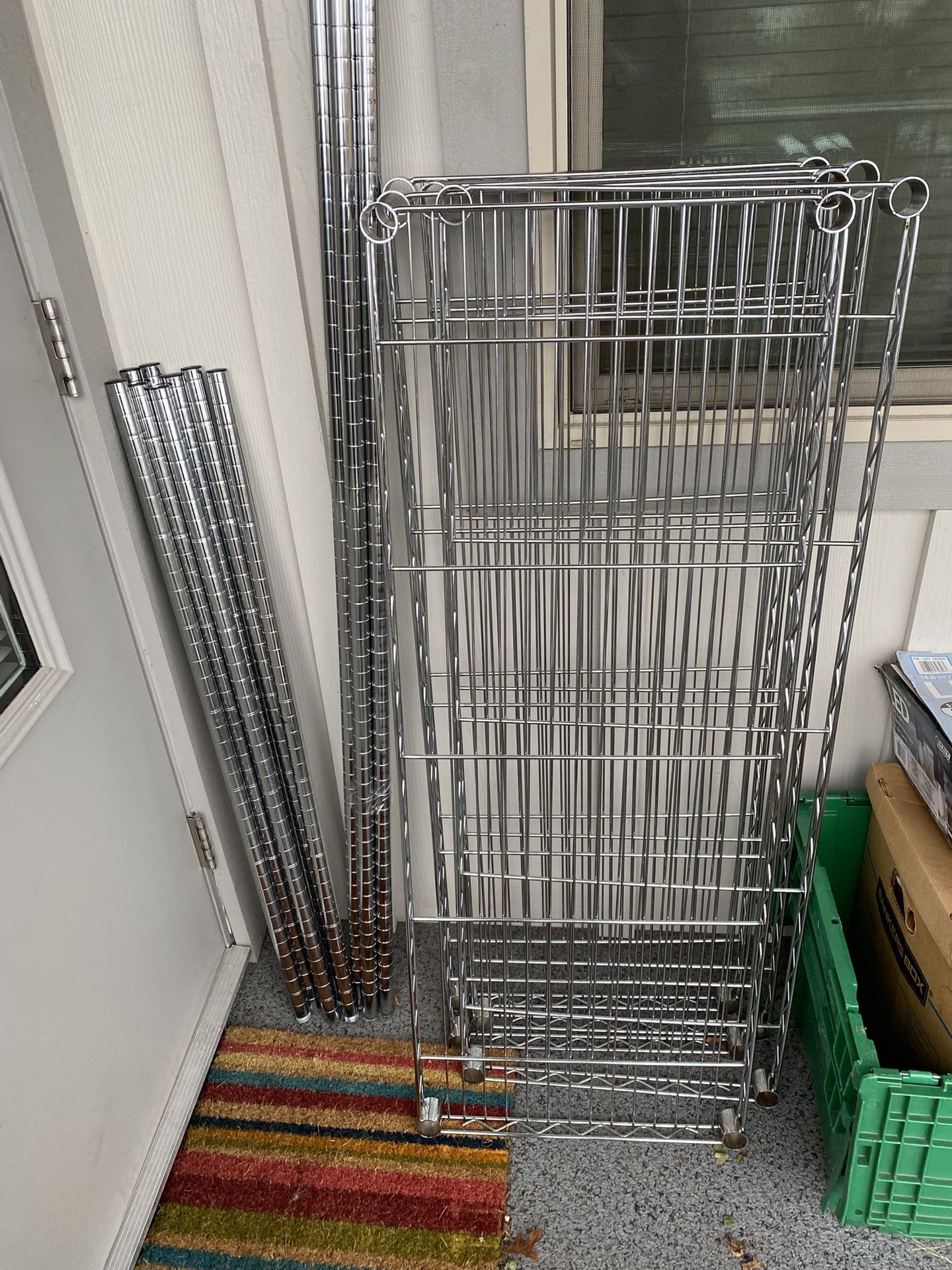2 sets of industrial grade metal rack shelving. Comes with new poles marked with numbers for easy setup. Also comes with shelf clips. Easy to assemble and customize to the shelf heights that you need. 18” x 48” $60 for 4 shelves, 4 poles and clips. $100 for both sets