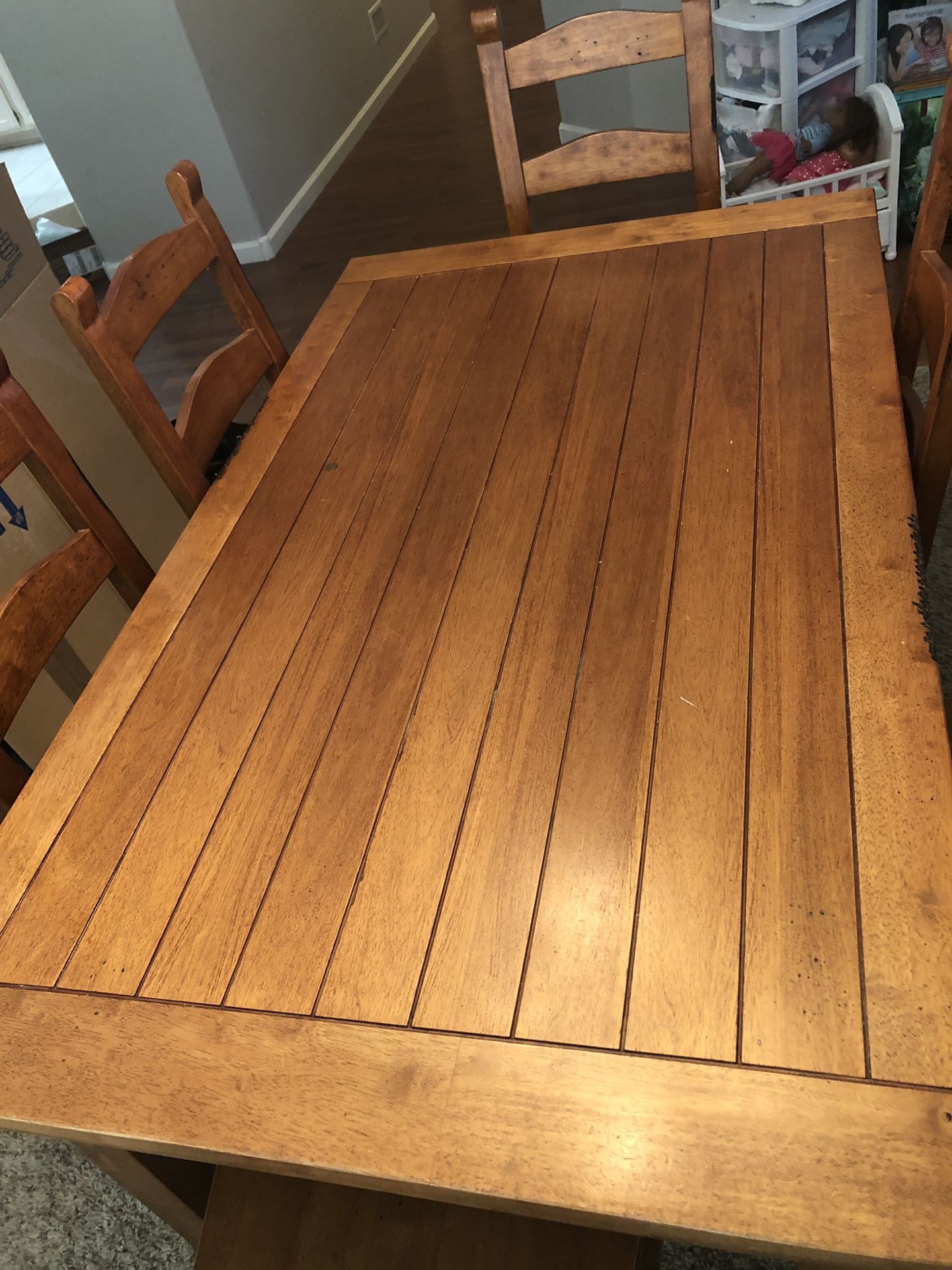 Nice dining room table, 6 chairs, table ends extend for more seating Both ends extend 18 inches each and store inside themselves