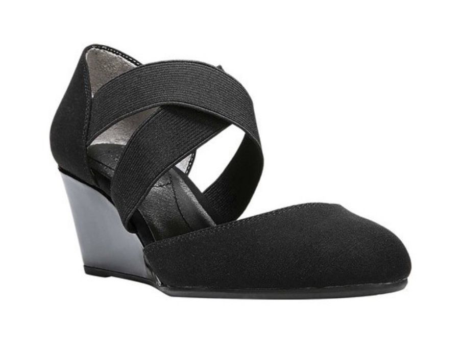 Life Stride Darcy wedges- black. Stretchy cross straps. Features Soft System technology. Offers support and flexibility. Soft cushioned fit arch. Heel is about 2.25”. Fabric upper and faux patent leather wedge. Size 8. 12