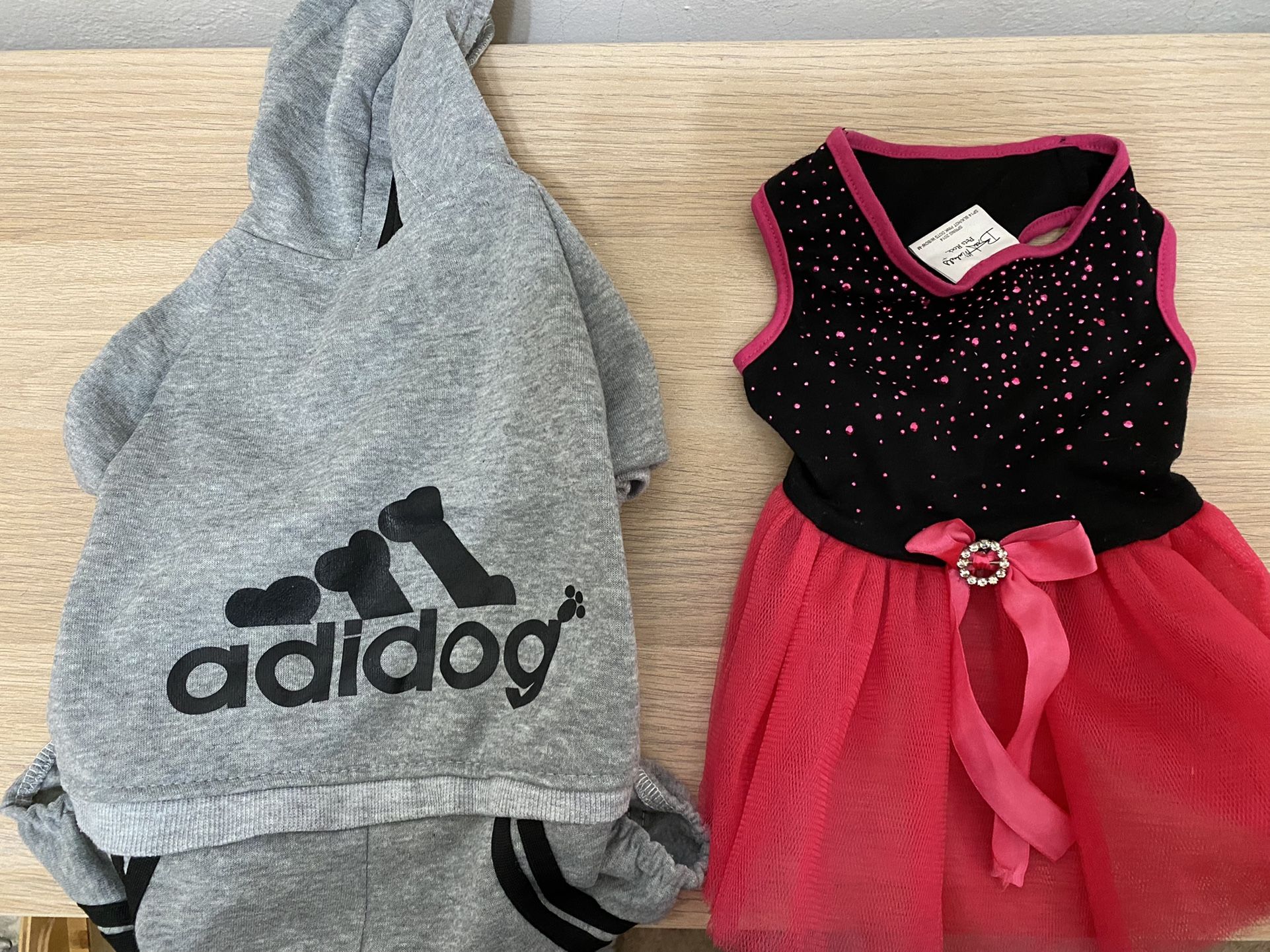 Used dog clothes. Only worn less than 5 times. They don’t have sizes on them but I’m guessing the adidogs is a medium and the pink dress is a small. $10 each or $15 for both.