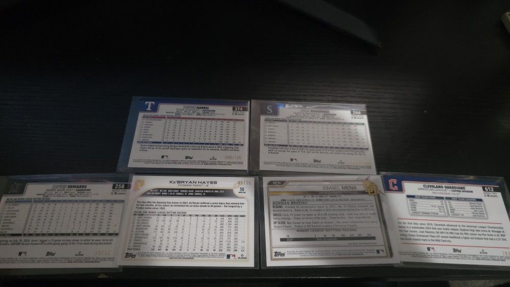 Dustin Harris Texas Rangers RC- 66/150 Julio Rodriguez Mariners- 1479/2025 Cleveland Guardians Team Card - 19/50 Ismael Mena Padres - 350/399 Ke'Bryan Hayes Pirates - 5/76 Xavier Edward's Marlins - 49/50