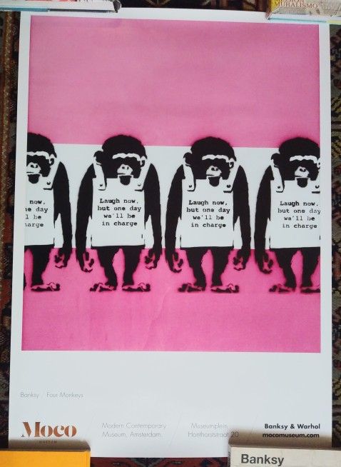 Hi there! New official poster from Banksy exhibit in Amsterdam Moco, size is 23" x 33" in tube. There's also in this lot a 1 dollar bill stencil, a Dismaland pin, and a program from the Dismaland venue. See pictures for reference! Pick up in San Francisco!