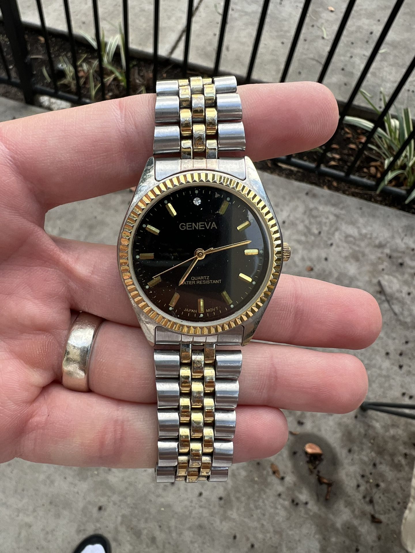 Classic Geneva men’s dress watch for sale. Features a black face with a crystal at the top and a gold-tone fluted bezel. Two-tone silver and gold band. • JUST INSTALLED A NEW BATTERY: Running perfectly and keeping great time. • Japan Quartz Movement. • Water Resistant. • Shows some cosmetic wear on the gold finish from use, but still looks very sharp on the wrist. Great budget dress watch for formal events or daily use.
