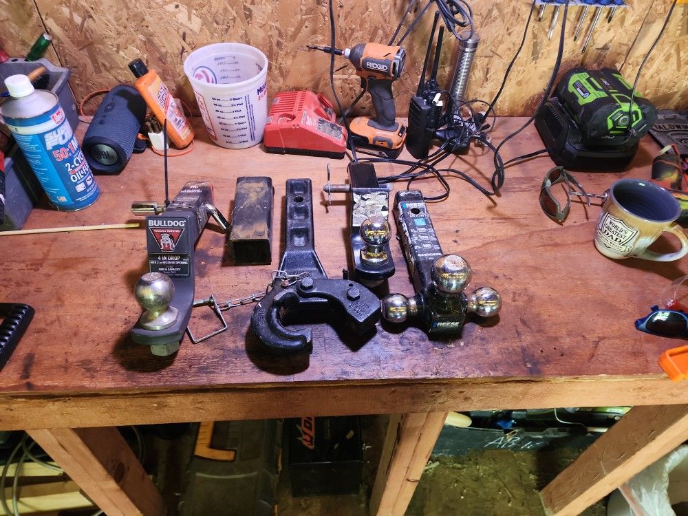 Multiple ball hitches and pintle Hook. 4 inch drop hitch. Hitch reducer. All together, $65 or make an offer.