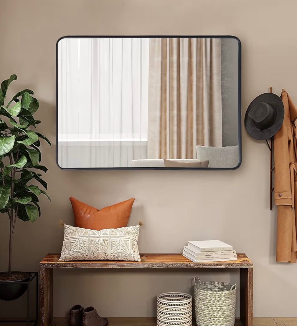 Brand new in box One of the hangers has come off on the back it is circled in red mirror can still be hung it has 2 ways to hang [Modern Durable Design) This 24x36 inch rectangular hanging mirror is delicately surrounded by an high quality black metal frame.The metal frame of this large wall-mounted mirror not only gives a unique, modern look and feel, but also doubles as a protective bumper, making it more durable than other average mirror, perfect for high-traffic areas like bathrooms and entryways • [High Quality) This black bathroom vanity mirror is made of 4 mm thick glass, bright and distortion-free reflection, produces a clear image. High Polished edges offers a finished, sleek look, and facilitate safety and cleaning. Premium silver backing can prevent corrosion in the high humidity environment like bathroom • (Boost Light & Decorative If you're planing to expand the visual space of a small room such as tiny bathroom, while need take into account the wall art. This rounded edge bathroom mirror will help you. Hang individually or in a set, Its reflective surface helps to attract natural and artificial light, helps light bounce back in the room, making the room appear larger and brighter in a instant • [Easy to Install) Pre-assembled and ready to hang. Wall mounted design, this vertical or horizontal hanging mirror can be installed in one step. Package contains all hardware accessories and instructions, including two screws (one is spare) (Modern and Elegant) This rounded corner mirror with peaked trim adopts clean and modern design, suitable for a variety of decorative styles, and brings instant fresh touch to your wall. Excellent modern appearance and practicability make it suitable for dressing table, bedroom, living room, waiting room, entryway, corridor, etc., which will benefit from any decoration