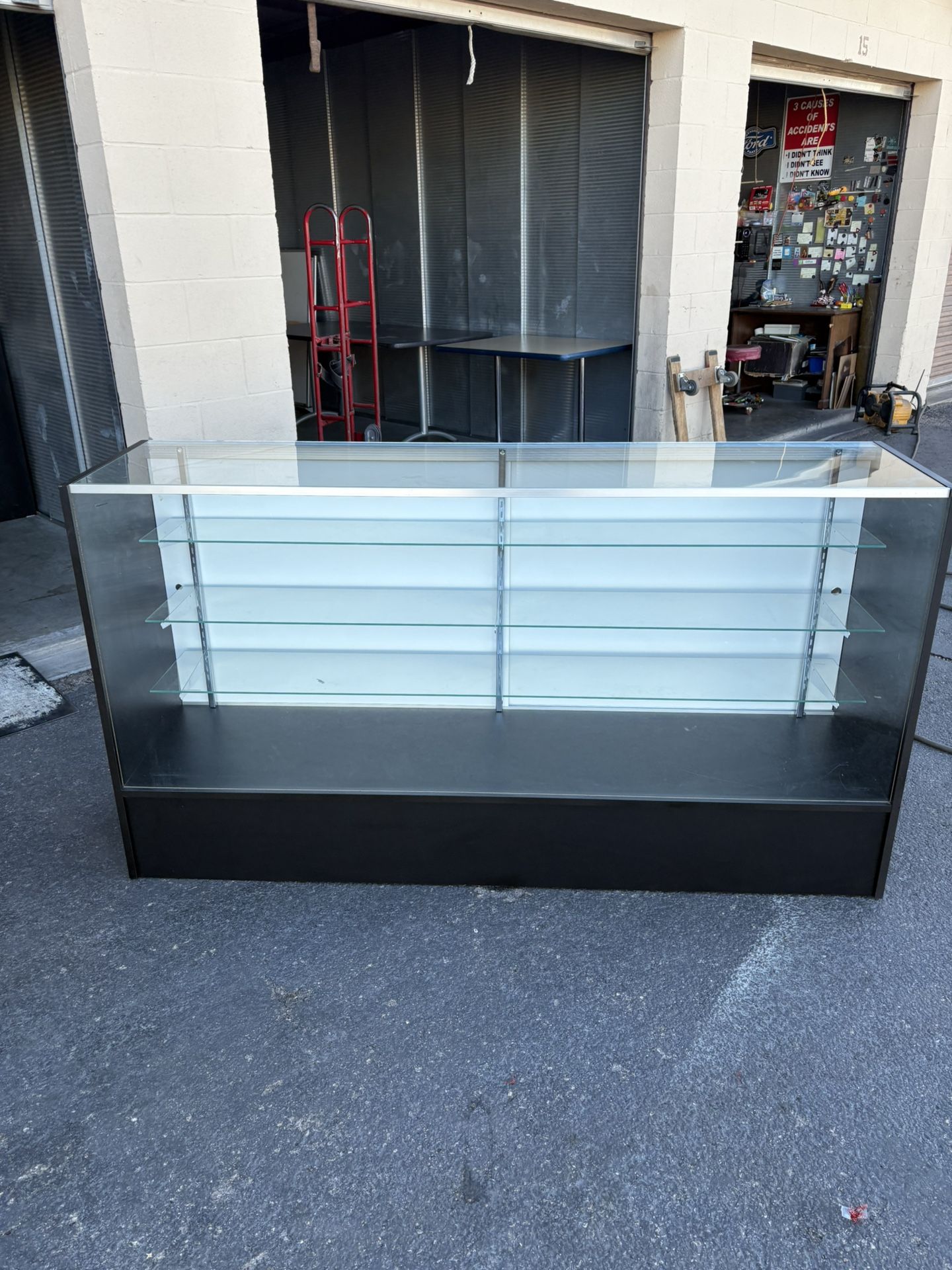 I have 5 of these nice glass display cabinets for sale in good condition. The glass does not have any cracks or chips. The glass tempered glass. each one has 3 adjustable shelves that go up and down or can be removed. You can take shelves out and put large stuff in there or put stuff on the shelves. Each one has 2 doors in the back that open and close nicely. They are 70 inches long and 38 1/4 inch tall and 18 inches wide. I was asking $155 each for these and I just reduced him to $130 each. Thank you and have a great day.