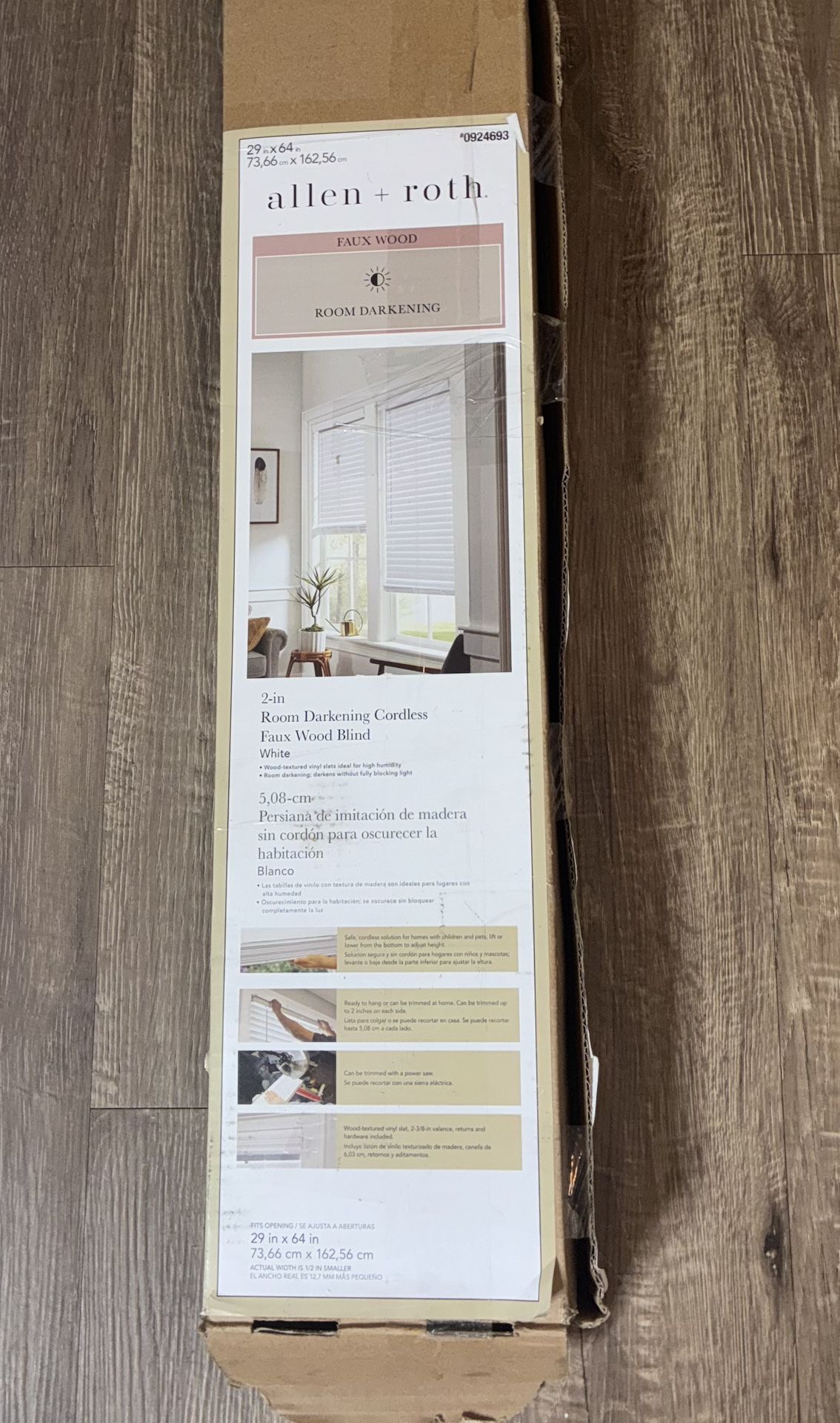 Selling Allen & Roth 2” Cordless Faux Wood Blinds – great quality and clean look! Color: White Room Darkening Cordless design – safe & modern Originally $31.98 – asking only $20