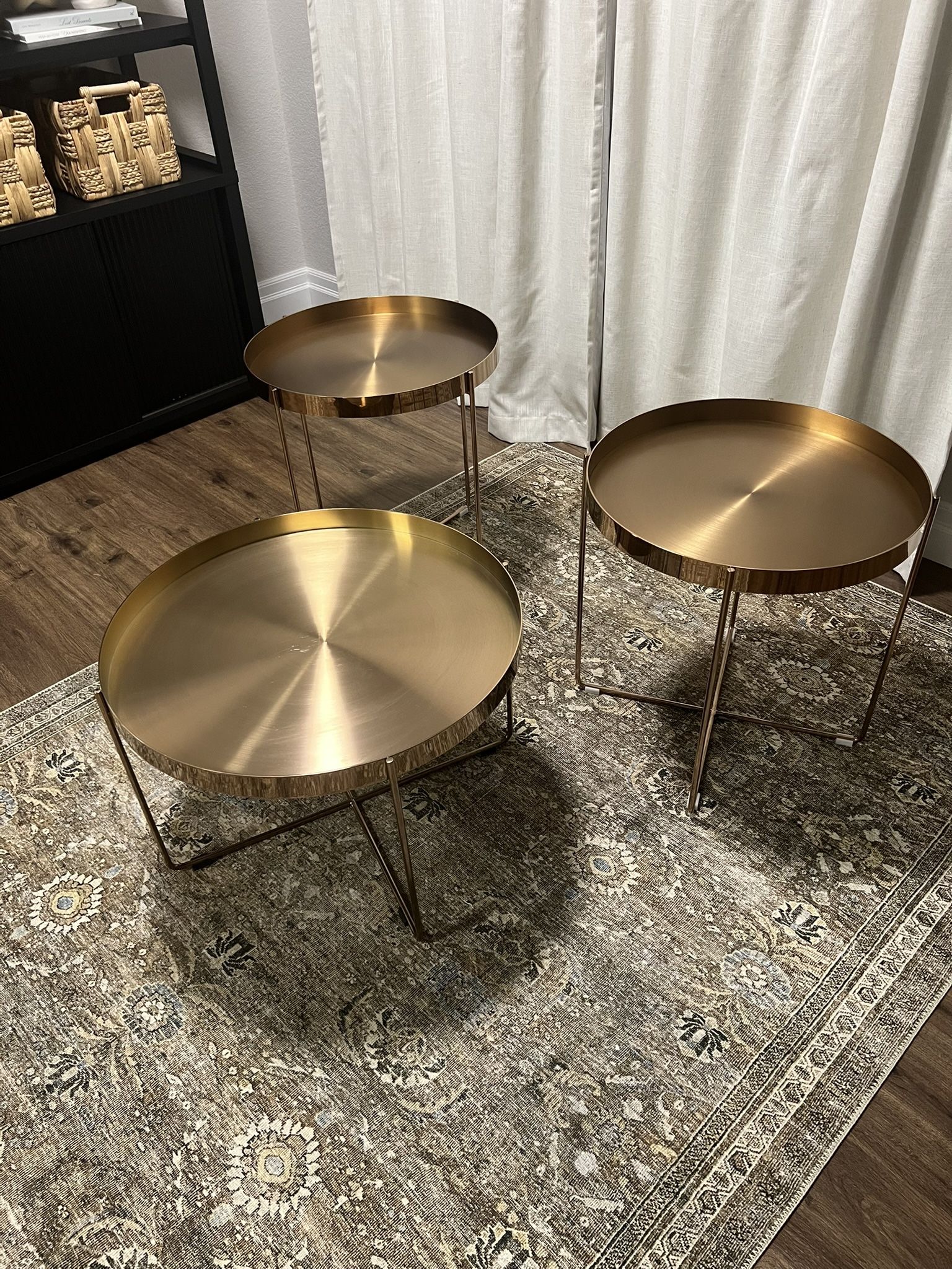 Sunpan Chelsea side tables: Only used for staging, high end quality furniture, solid stainless steel construction. In great condition, only larger table has minor scuffs. Large table dimensions: 23.5 inch diameter, 16 inch in height. Slightly more brass in color. Small scuffs near center, pictured, only noticeable from certain angles. Smaller table dimensions: 19.5 inch in diameter, 20 inch in height. Slightly more rose gold in color.