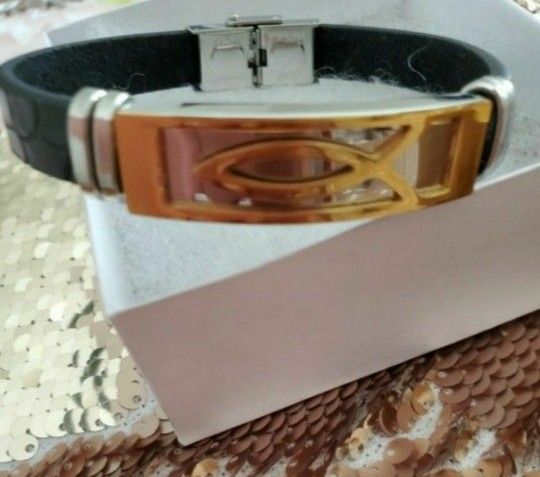 Unisex Wrist Band Stainless-steel Fish Christian, Gold Accent Casual Bracelet Bangle . New Comes with Gift Box.Religious fish two tone Silver and gold, definitely a statement piece. Would make a great gift for anyone, anytime. Offers Welcome! Bundle Discounts! Same day shipping Available!