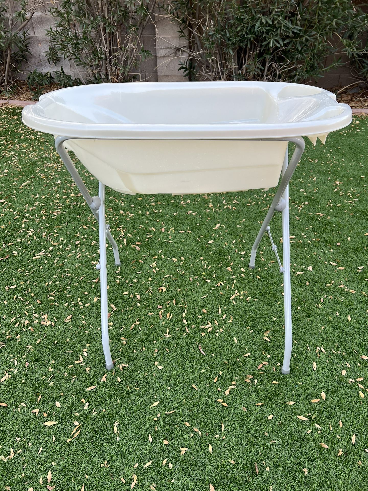Standing baby bath with foldable stand.