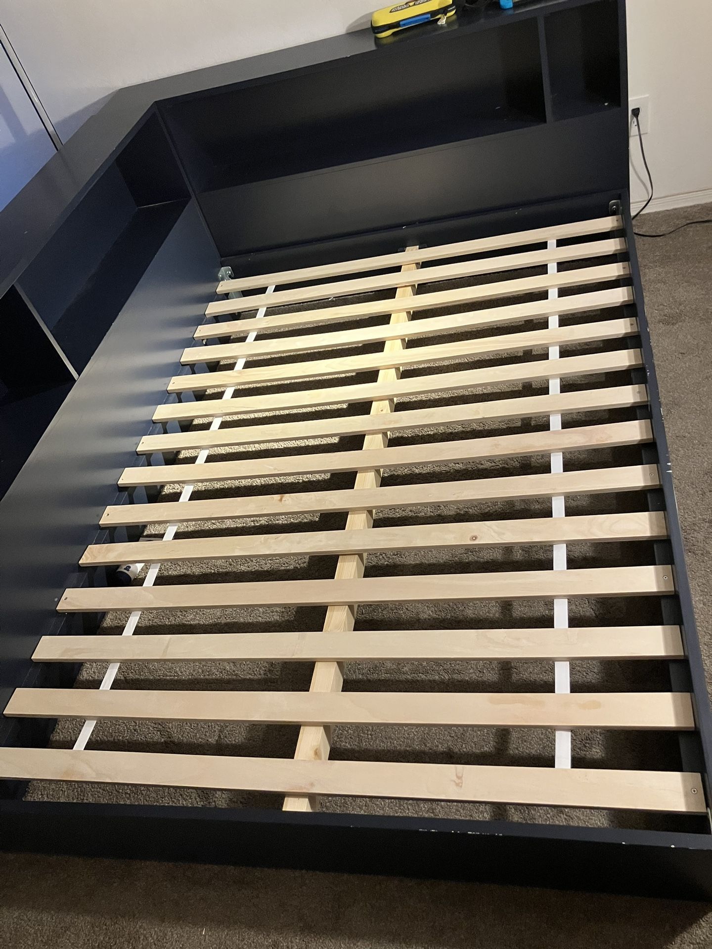Kids wood bed frame for a full or double size mattress. Has inserts around the frame to put whatever your kids would like. My son would put his night time book, Nintendo switch, a night light and other miscellaneous. It’s a nice dark blue navy blue color. Frame Sizes are 5’ 5” wide 7’ 4 1/2” long 2’ 7 1/2” tall Inserts are 8 1/2” deep 11 1/2” tall