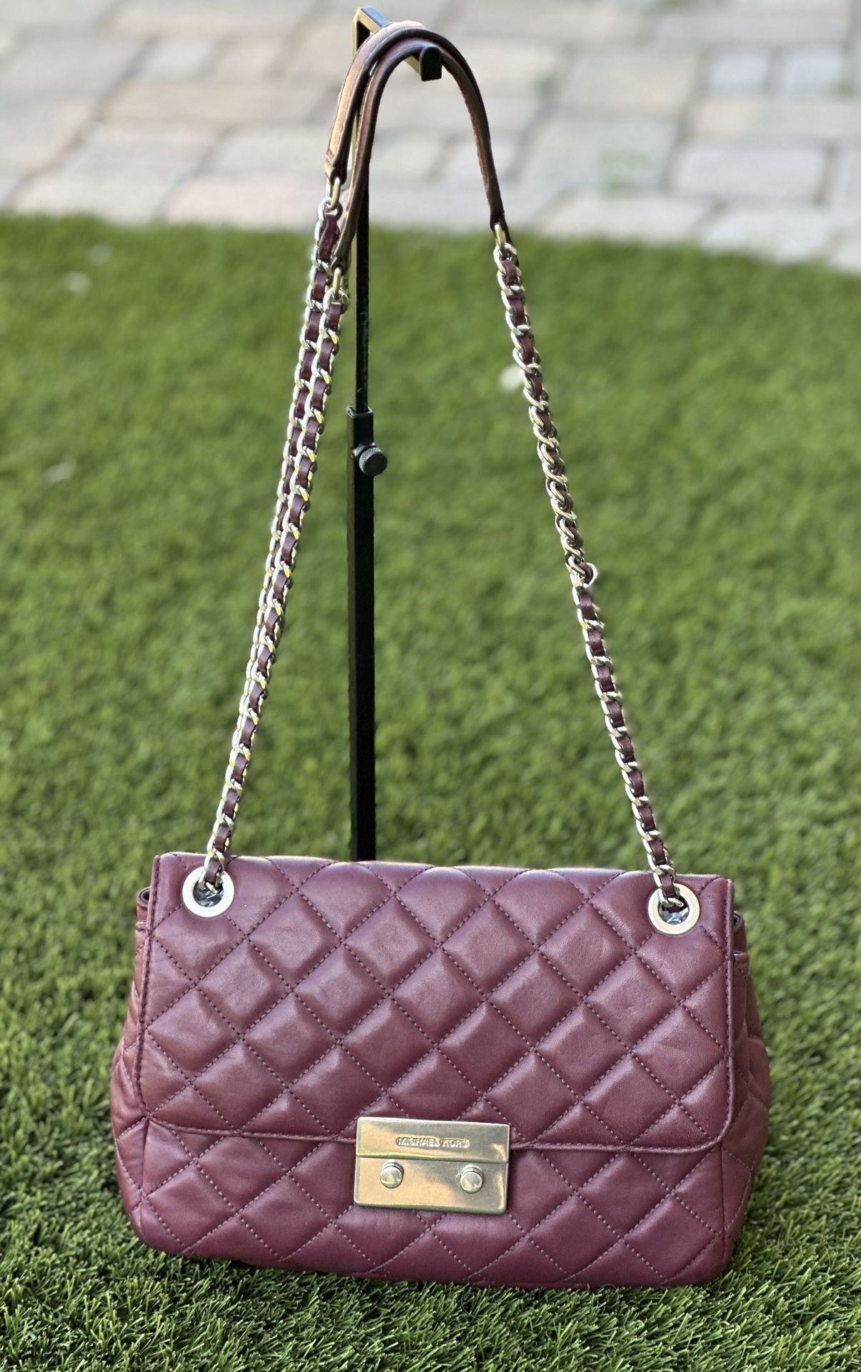 Beautiful authentic Michael Kors sloan bag made of quilted lamb leather, in good used condition, 11"L x 3.5"W x 6.75"H. Asking $65 Firm, Can be worn 2 ways. Bolsa Michael Kors autentica de piel de cordero en buenas condiciones. Mide 11"L x 3.5"W x 6.75"H. Originalmente costaba mas de $300, pido $65 firme. Located by/vivo por Unser & Ladera See less