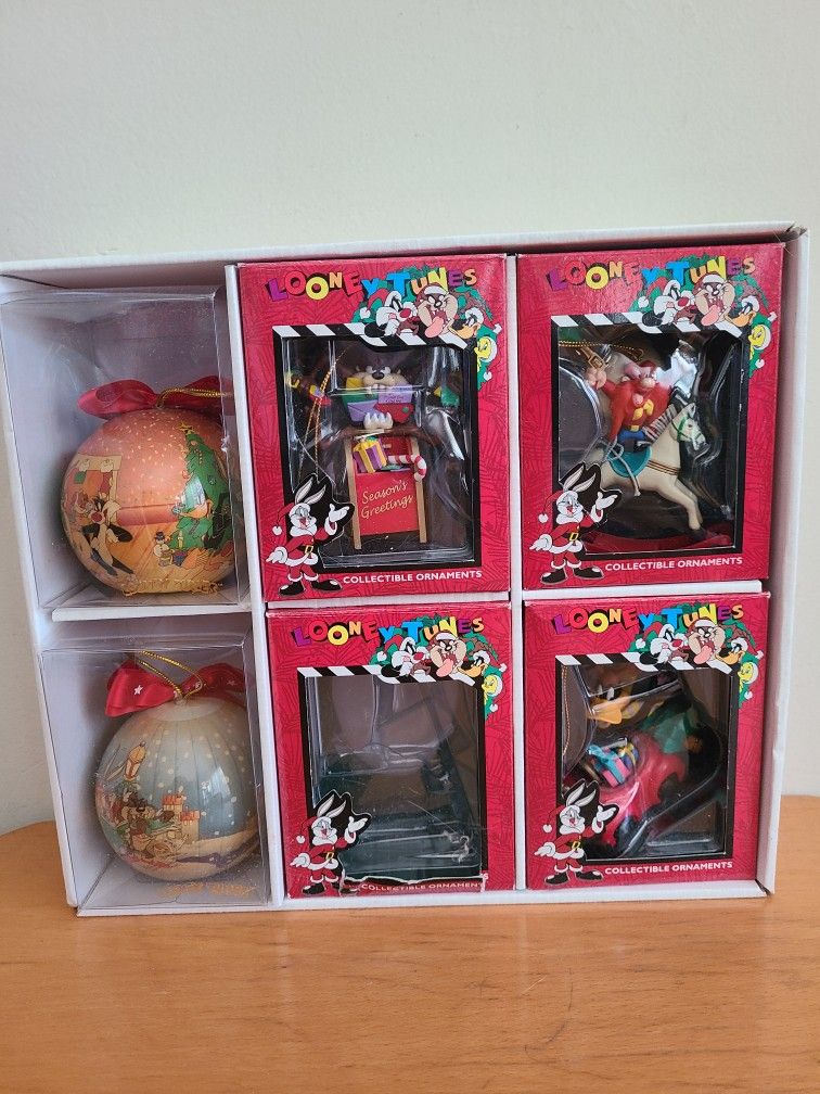 Vintage Looney Tunes Christmas Ornamentsm Sets Of 6 With Storage Box.